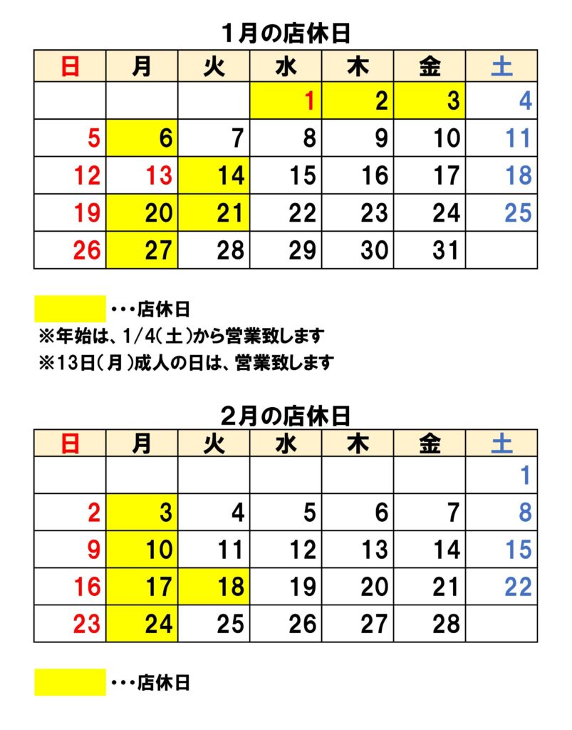 2025年1月の店休日は