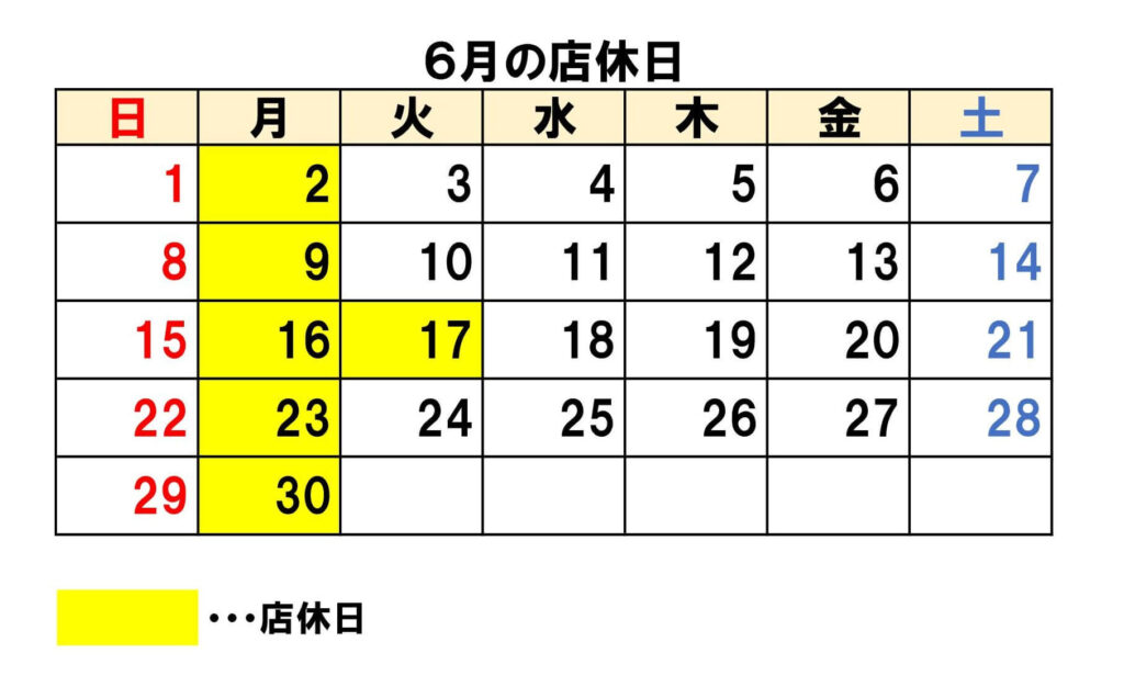 【6月のお休み】 📅 6月2日(月) 📅 6月9日(月) 📅 6月16日(月) 📅 6月17日(火) 📅 6月23日(月) 📅 6月30日(月)